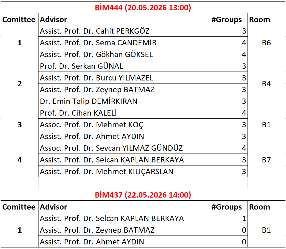 The presentations for the BIM444 (Computer Engineering Applications) and BIM437 (Computer Engineering Design) courses will be held on the following dates: