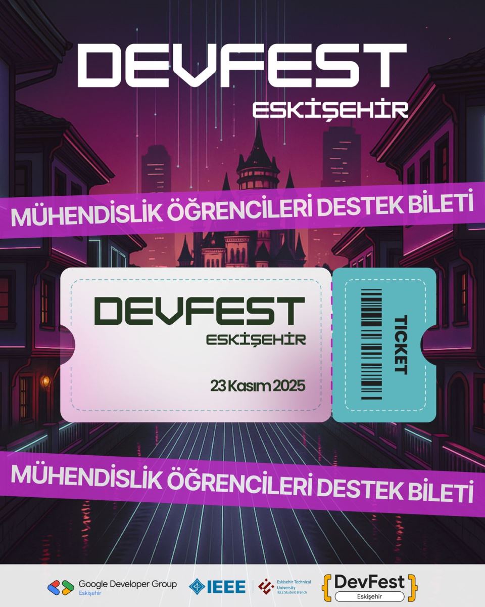 Organized by GDG Eskişehir in collaboration with the IEEE Eskişehir Technical University Student Branch, DevFest Eskişehir is a technology festival featuring sessions, workshops, and networking opportunities in areas such as artificial intelligence, cloud, mobile, web, and product development.